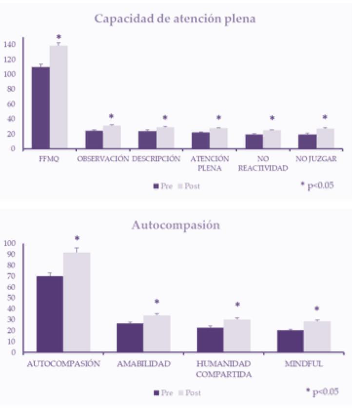 En líneas generales los resultados mostraron la existencia un aumento significativo en la capacidad de atención plena; un aumento significativo de autocompasión, amabilidad y humanidad compartida; una mejoría significativa en el bienestar psicológico, aumentando el afecto positivo, satisfacción con la vida, vitalidad subjetiva y disminuyendo el afecto negativo; una disminución en el dolor estadísticamente significativa, así como menores interferencias del dolor en las actividades. Este cambio positivo ha sido encontrado también en estudios previos [41,42].